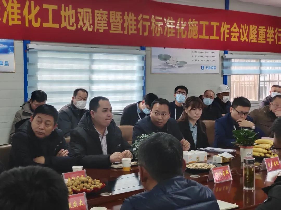 現(xiàn)場參觀活動后,按照活動安排在名邦·鯤鵬御府和園項目部會議室召開現(xiàn)場交流會。安徽森晨建設(shè)工程有限公司現(xiàn)場負責(zé)人周文浩率先就安全文明、質(zhì)量管控標準化施工管理經(jīng)驗做分享總結(jié)報告,整個報告結(jié)合實景照片,內(nèi)容詳實,要點突出,以點帶面,涵蓋了施工現(xiàn)場安全文明管理、管理團隊質(zhì)量管控意識提升、班組工人技能水平等多方面。通過多角度、多層次、多維度分析總結(jié)了名邦·鯤鵬御府和園項目在安全文明、質(zhì)量管控標準化方面取得驕人成績背后的經(jīng)驗秘訣,讓與會人員受益頗深。