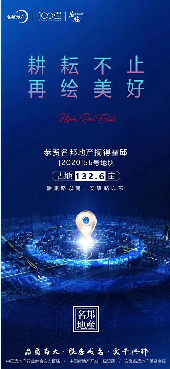 2020年7月24日上午,名邦地產(chǎn)成功競得霍邱【2020】56號地塊,該地塊位于霍邱縣城關(guān)鎮(zhèn)潘集路以南、安康路以東,占地約132.6畝。