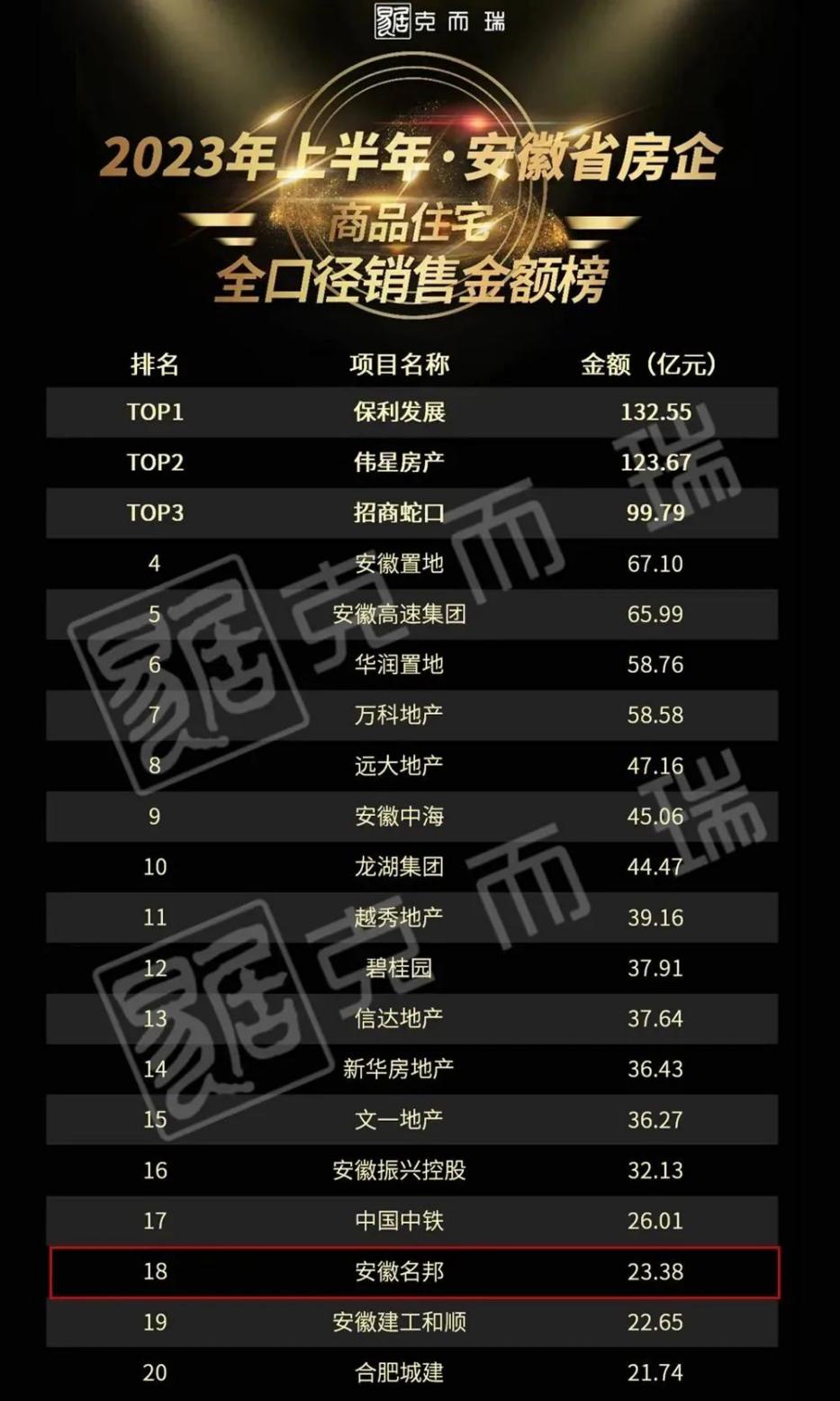 2023年上半年安徽省房企全口徑銷售金額榜單